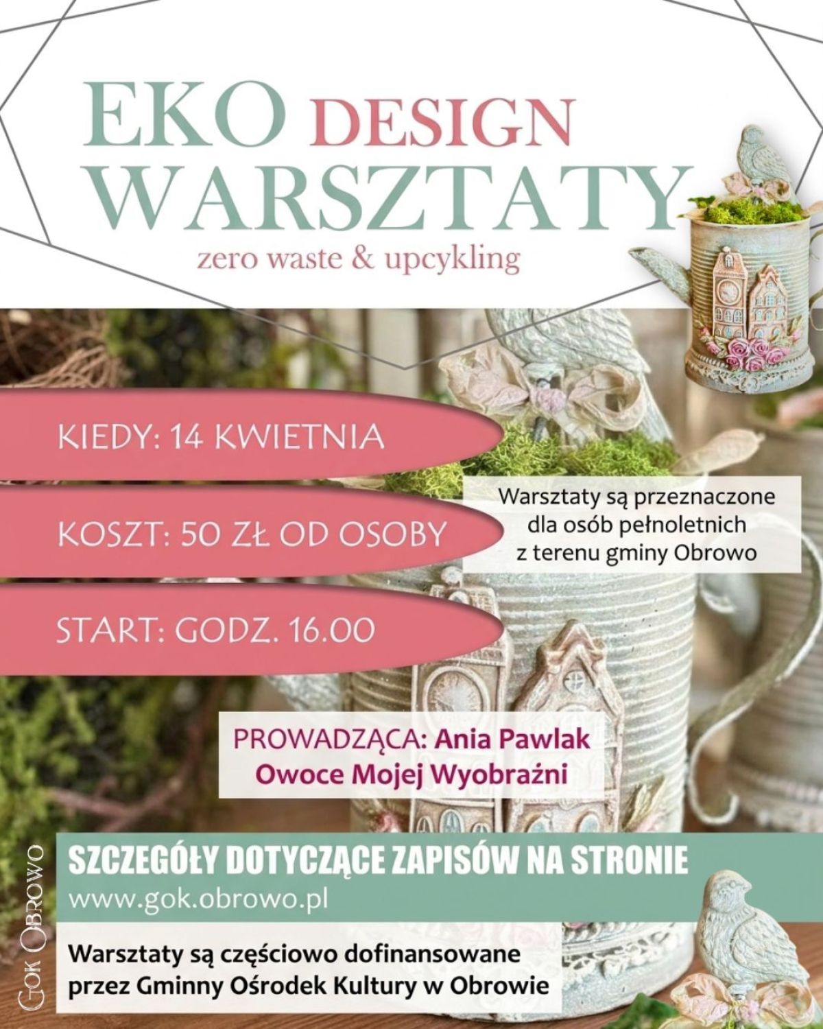 Osoby zainteresowane udziałem w warsztatach proszone są o zgłoszenie chęci uczestnictwa poprzez zamieszczenie komentarza o treści „EKO” pod postem na profilu Facebook Gminnego Ośrodka Kultury w Obrowie informującym o warsztatach.