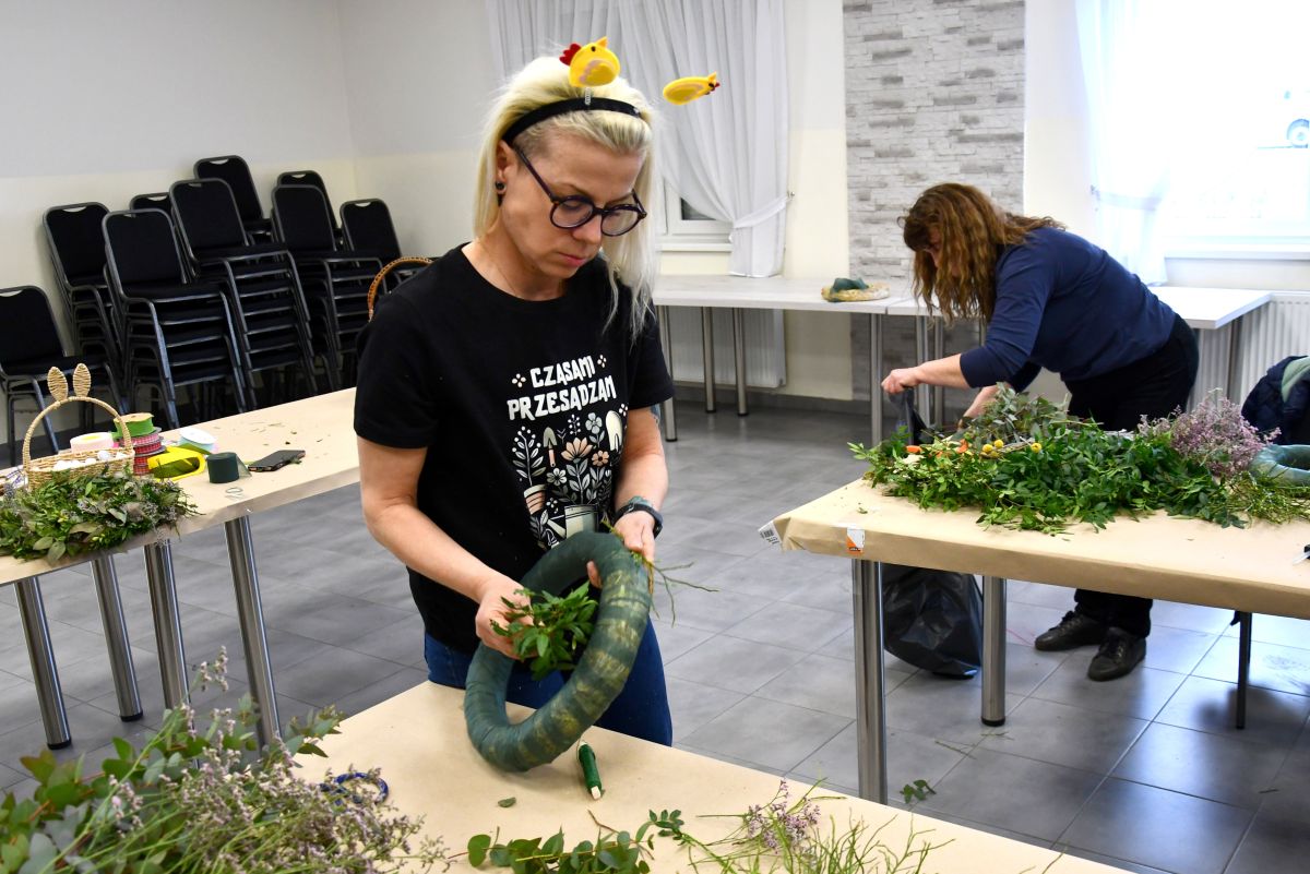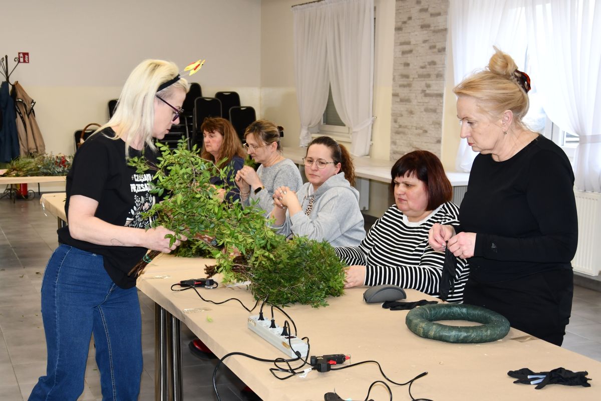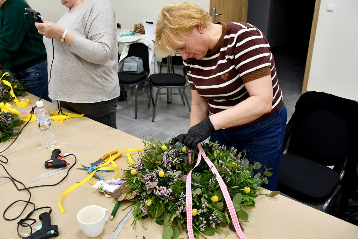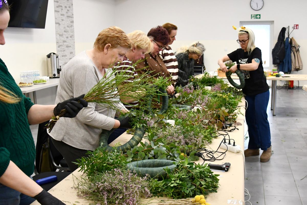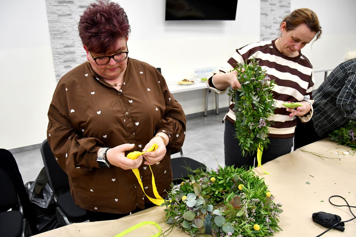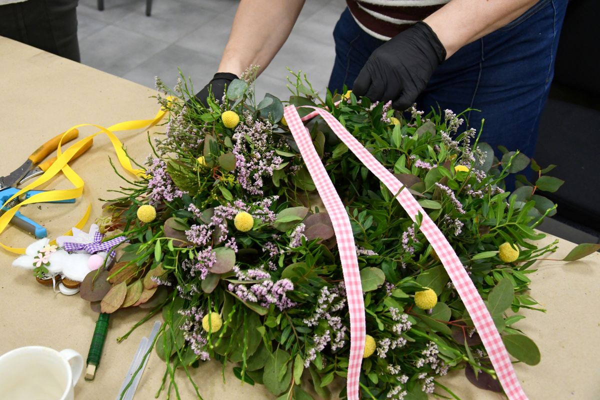 Zajęcia poprowadziła Pani Beata z Pracowni Florystycznej Centrum Ogrodniczego „Zielony Zakręt”, dzieląc się swoją wiedzą, doświadczeniem oraz pasją do florystyki. Uczestniczki miały okazję samodzielnie wykonać efektowne wianki, wykorzystując takie materiały jak eukaliptus, limonium, kraspedia, pistacja oraz gałązki borówki (Vaccinium myrtillus). Kompozycje zostały dodatkowo ozdobione elementami nawiązującymi do nadchodzących Świąt Wielkanocnych.