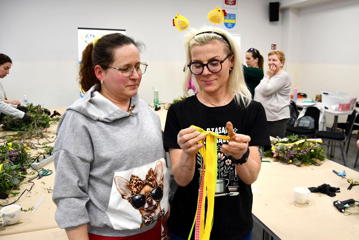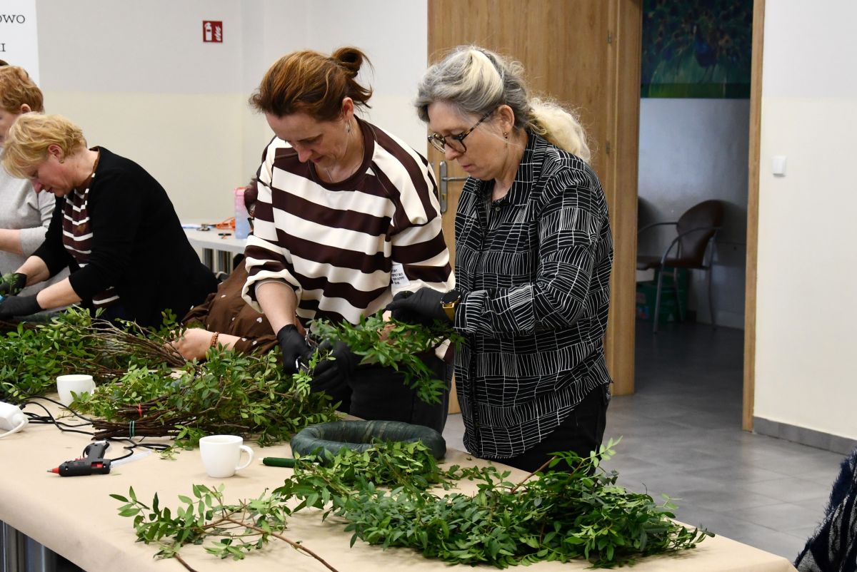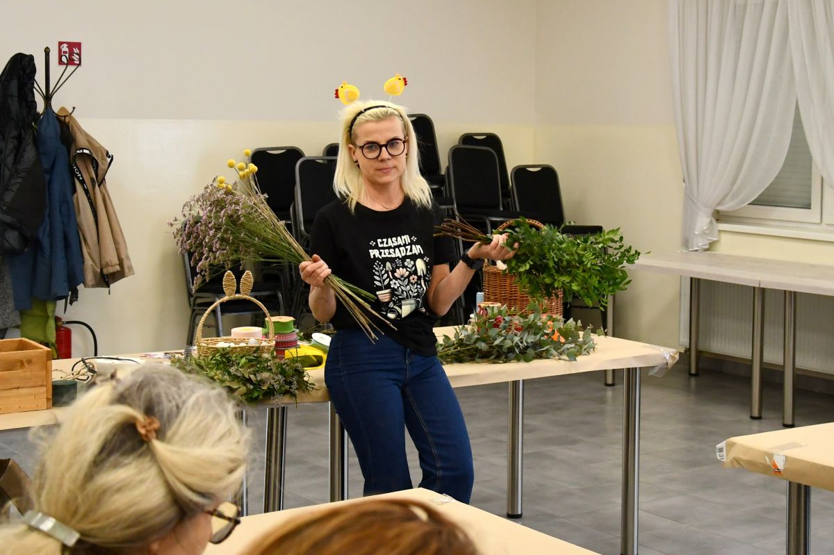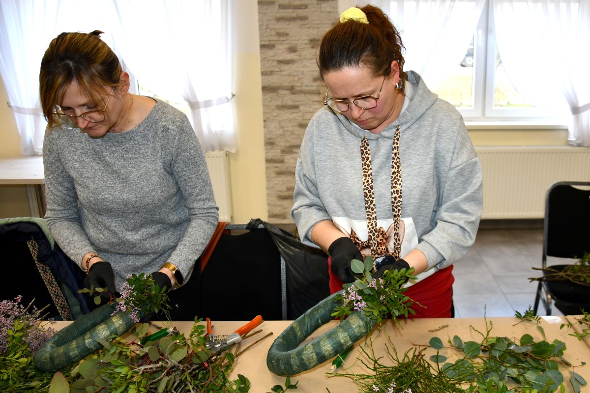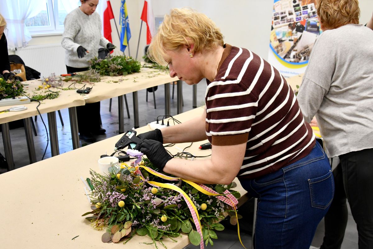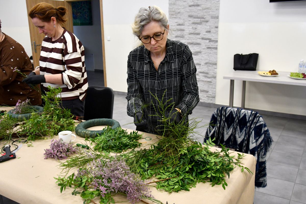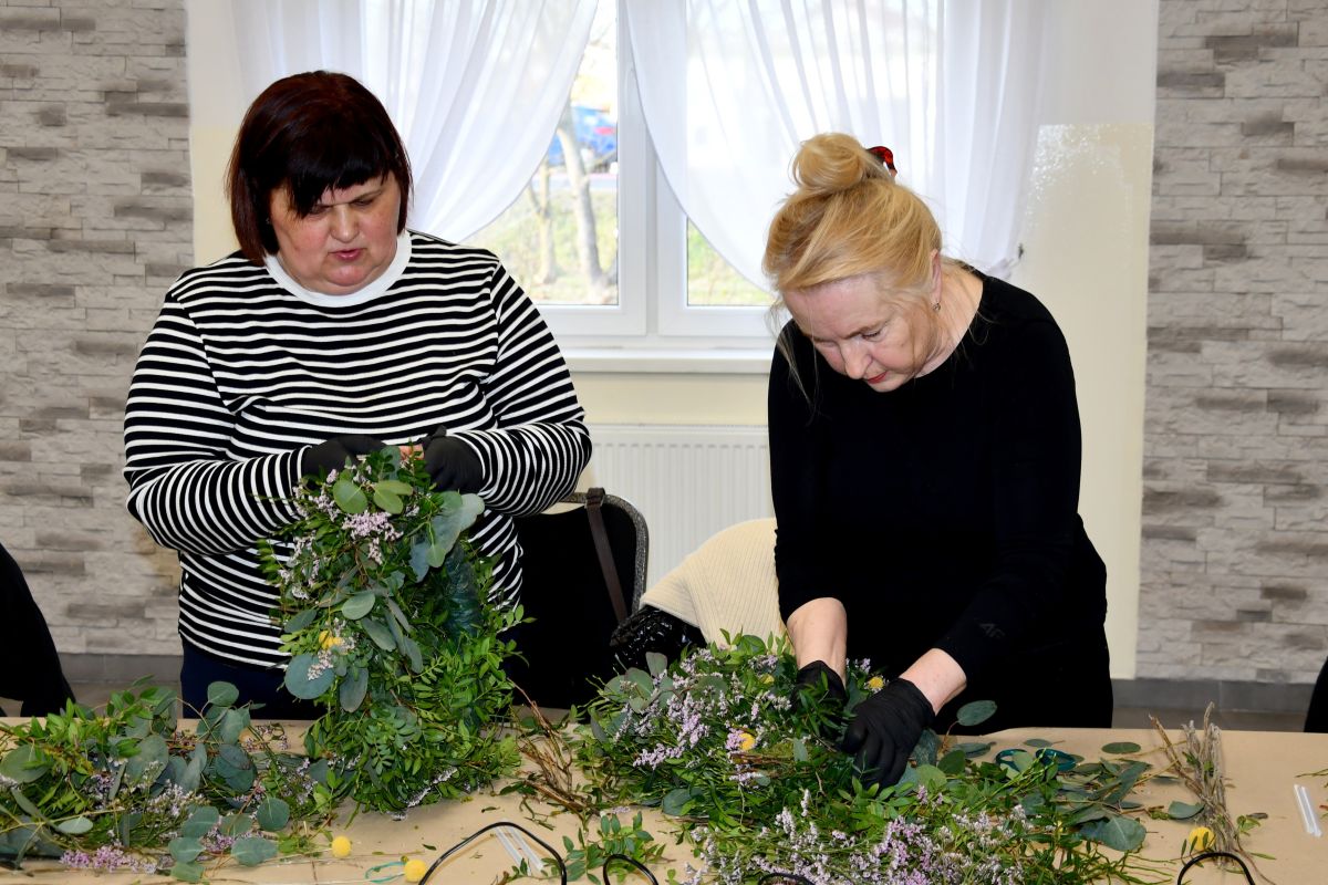 Zajęcia poprowadziła Pani Beata z Pracowni Florystycznej Centrum Ogrodniczego „Zielony Zakręt”, dzieląc się swoją wiedzą, doświadczeniem oraz pasją do florystyki. Uczestniczki miały okazję samodzielnie wykonać efektowne wianki, wykorzystując takie materiały jak eukaliptus, limonium, kraspedia, pistacja oraz gałązki borówki (Vaccinium myrtillus). Kompozycje zostały dodatkowo ozdobione elementami nawiązującymi do nadchodzących Świąt Wielkanocnych.