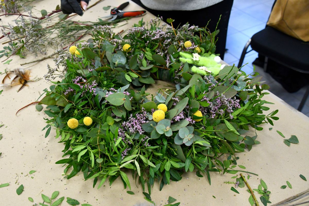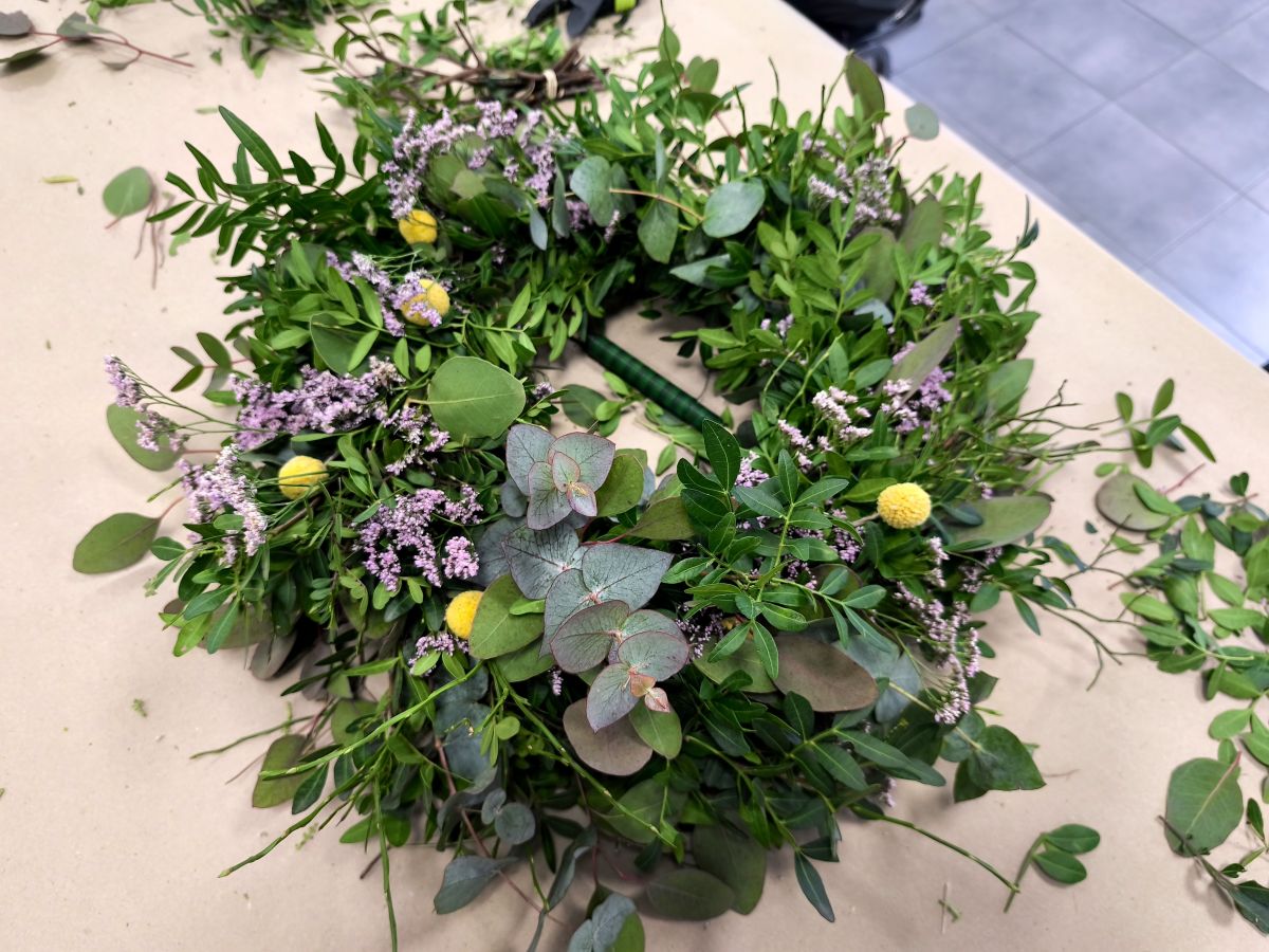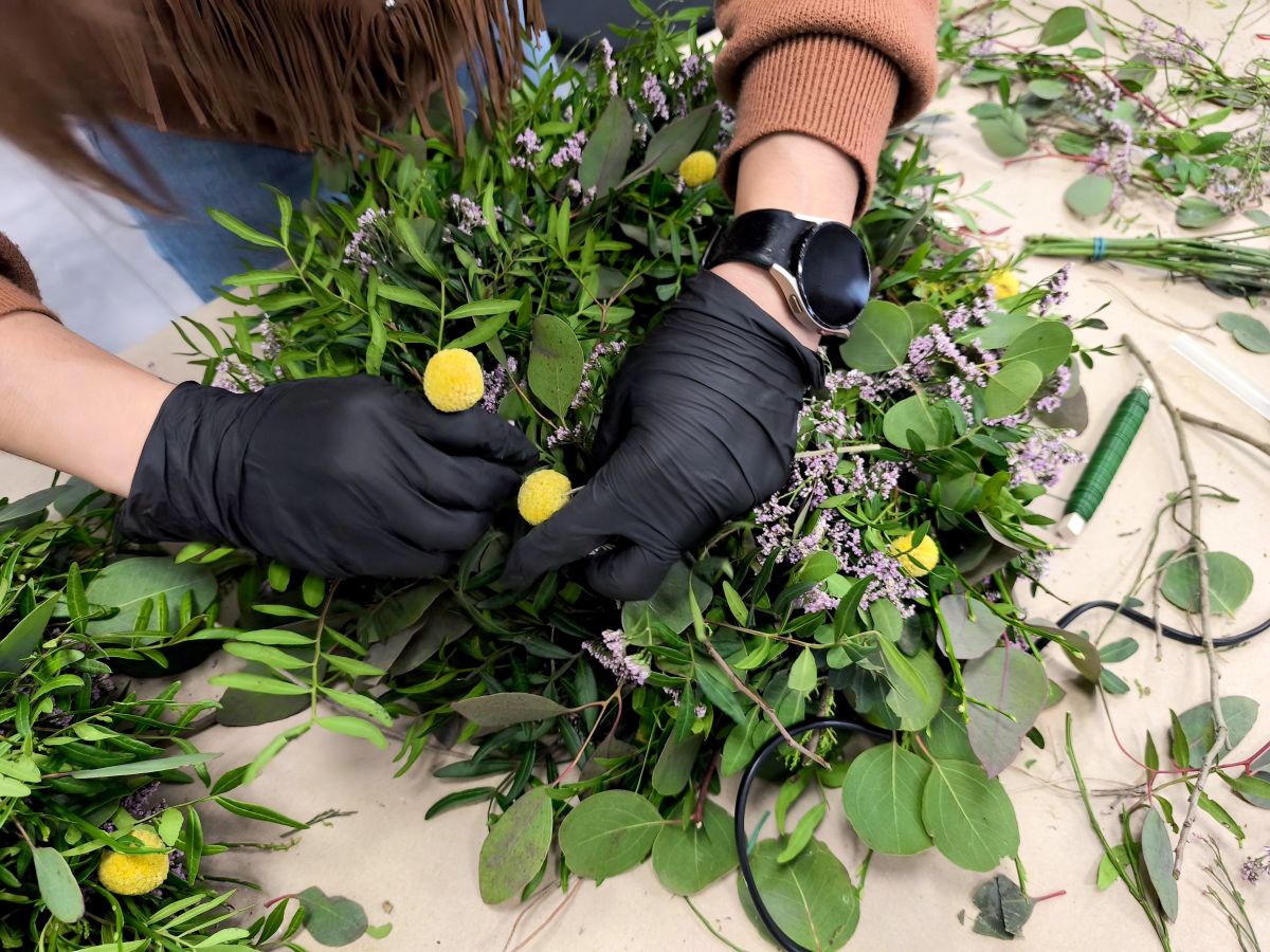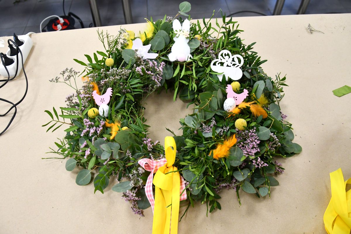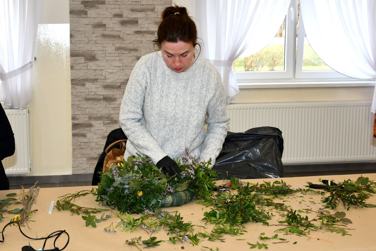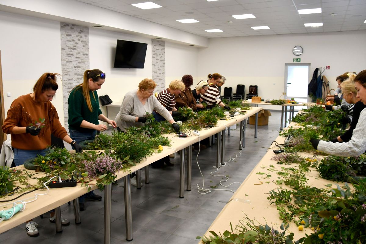 Zajęcia poprowadziła Pani Beata z Pracowni Florystycznej Centrum Ogrodniczego „Zielony Zakręt”, dzieląc się swoją wiedzą, doświadczeniem oraz pasją do florystyki. Uczestniczki miały okazję samodzielnie wykonać efektowne wianki, wykorzystując takie materiały jak eukaliptus, limonium, kraspedia, pistacja oraz gałązki borówki (Vaccinium myrtillus). Kompozycje zostały dodatkowo ozdobione elementami nawiązującymi do nadchodzących Świąt Wielkanocnych.